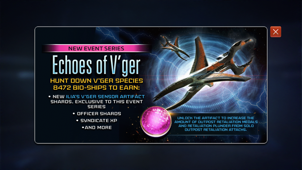 This series also introduces a new Artifact, Ilia’s V’ger Sensor, available only through participation in Echoes of V’ger and exclusive to this event series.. At higher levels, it significantly increases Outpost Retaliation Medals and Retaliation Plunder earned from Solo Outpost Retaliation attacks (up to 180% at Level 12).