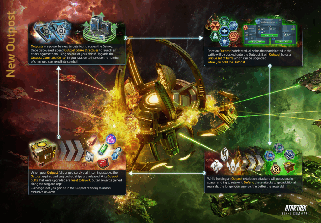 The Outpost Control Center grants access to the Outpost Refinery with a wide slate of rewards, including base and Sigma Resources, Materials, Vengeance Blueprints, Federation/Klingon/Romulan Ship Refits, Epic Officers, multiple Prime Particles, and more.