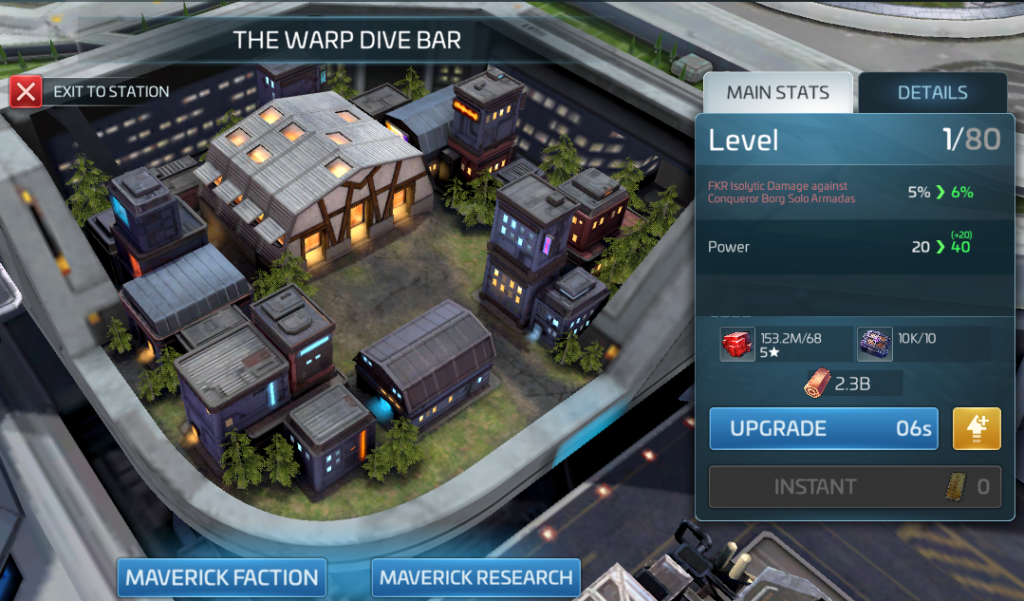 The Warp Dive Bar is the new faction building and serves as the entry point to the Maverick Faction and its associated Research Tree.
