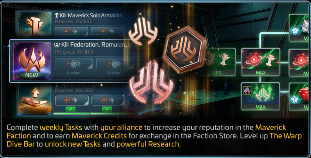 After completing the mission chain claimable in the Gift Section for Ops 55+ players, the Warp Dive Bar unlocks the Maverick Faction and scales in power as it levels up, providing increased bonuses, additional Task Keys, and expanded bundle rewards.