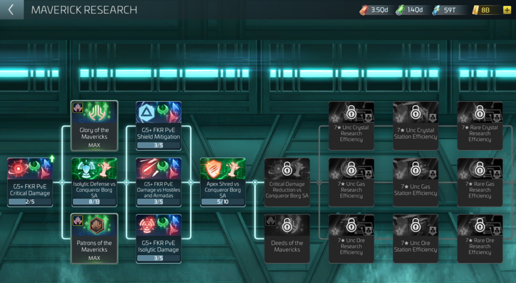 G7 research nodes further expand progression, focusing on Critical Damage Reduction against Borg Conqueror Solo Armadas as well as dedicated G7 Research and Station cost efficiency for both Uncommon and Rare materials.