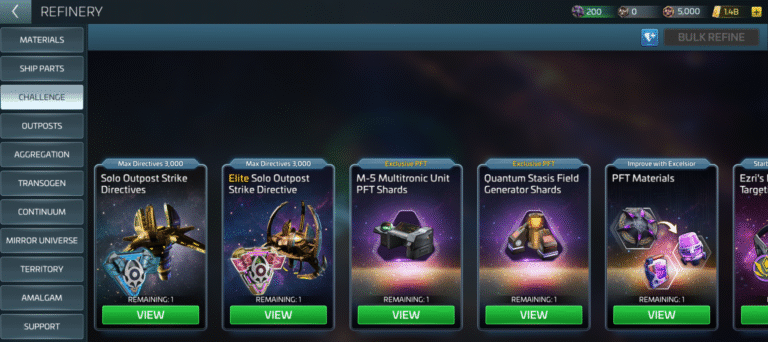 Early Observatory levels broaden access to Outpost content by adding Solo Outpost Directives to the Challenge Refinery at level 10 and Elite Solo Outpost Directives at level 20. At higher levels, the Observatory opens additional progression paths, including free daily access to the V’Ger Bounty Challenge at level 71, allowing Commanders to earn Challenge Track Points without relying on store contracts.